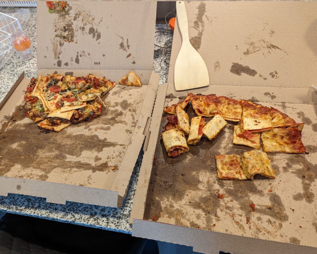 On move day, Sheila and David wanted to thank our crew by ordering pizza for lunch. Sheila placed the order and sent David to pick it up. As time passed, we started to worry that it was taking him so long to get back. Then, in walked David—pizza boxes sideways under each arm, a liter of soda dangling from each hand, and a sheepish smile on his face. Sheila’s jaw dropped, and we all burst out laughing together. When we opened the boxes, we discovered pizza rolls instead of pizza—a happy accident that turned into one of our favorite moving day memories. We were touched by his determination to accomplish his thoughtful catering assignment. We all enjoyed the meal, sharing laughter and camaraderie, making the day feel less like work and more like a family gathering.